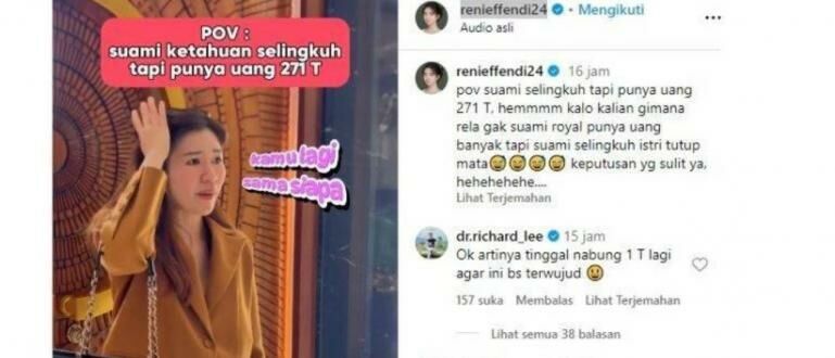 Konten viral ini berhasil mencuri perhatian publik dan menjadi topik hangat di media sosial. Apalagi dalam keterangan foto, istri dr. Richard bertanya kepada para pengikutnya tentang pendapat mereka mengenai suami yang berselingkuh tetapi kaya raya.