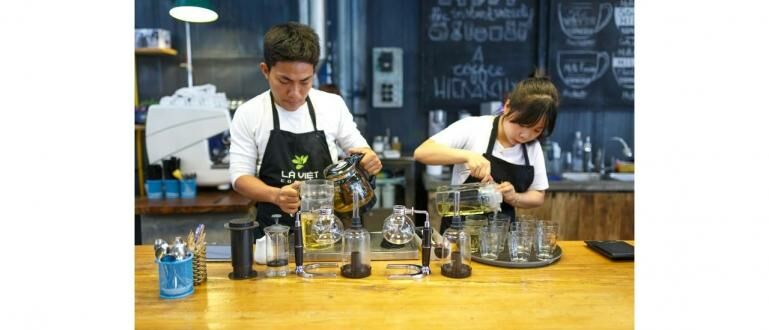 - Menyebutkan makanan yang dipesannya yaitu Hot Latte. - Mengomentari suasana kafe yang tenang dan cocok untuk bekerja. - Memberikan ulasan tentang bangunan kafe yang terdiri dari dua rumah dan memiliki area indoor dan outdoor.